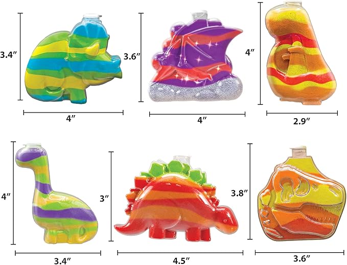 - 6 Fun-Shaped Bottles: T-Rex, Brachiosaurus, Stegosaurus, Triceratops, Pterodactyl, Fossilized Skull — This Diy Sand Art Kit Comes With 6 Bottles In Different Shapes & Sizes!