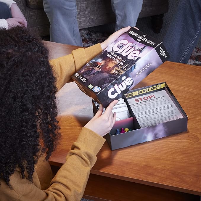- ESCAPE AND SOLVE MYSTERY GAME: Clue Treachery at Tudor Mansion offers the suspense and intrigue of the classic murder mystery game, Clue, in a dynamic escape room board game. 1-6 players, ages 10+