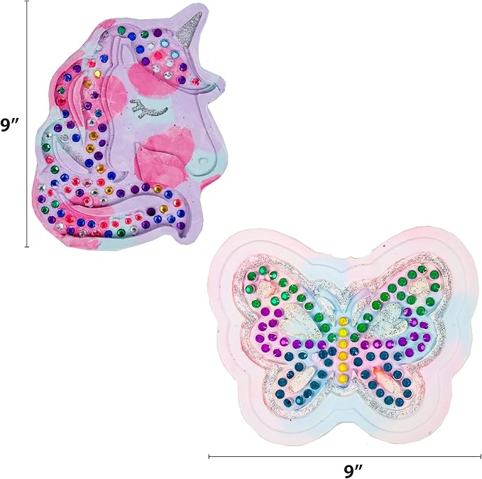 - SET INCLUDES: 1 Silver Glitter Glue Tube (6 mL), 3 Bags of Plaster (1 lb. Each), 1 Pair of Protective Gloves, 1 Protective Mask, 1 Mixing Stick, 3 Coloring Dyes, 240 Colorful Acrylic Gemstones, 2 Foam Shapes, 2 Molding Trays (1 Butterfly, 1 Unicorn) 9 in. x 0.75 in. x 7 in. Each, Easy-to-Follow Instructions