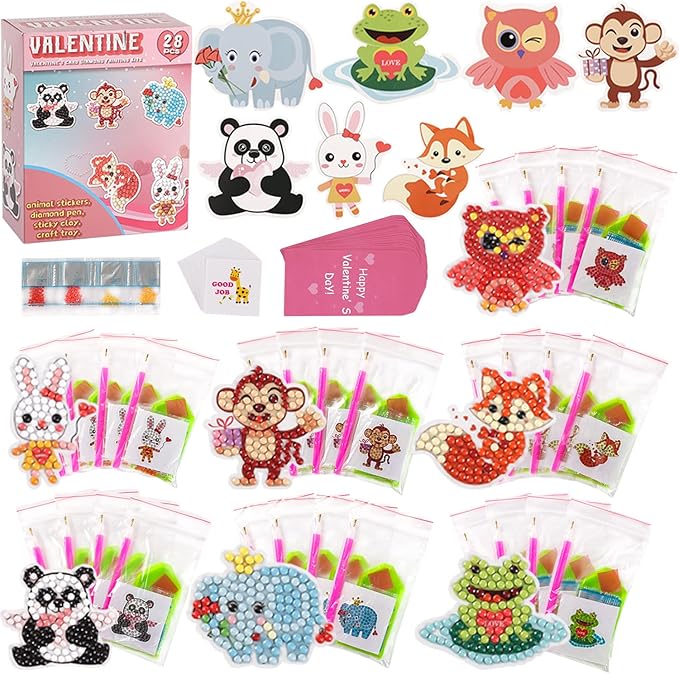 - ❤️Such A Funny Value Kit - These Valentine's day cards come with 28 packs of Diamond craft Kits in 7 vivid cartoon animal patterns, plus 28pcs kids Valentine's Day cards with Envelopes. Each pack includes a greeting card, a diamond sticker, one DIY kit, and a pink envelope. Sufficient quantity can serve as class exchange gifts for both boys and girls.