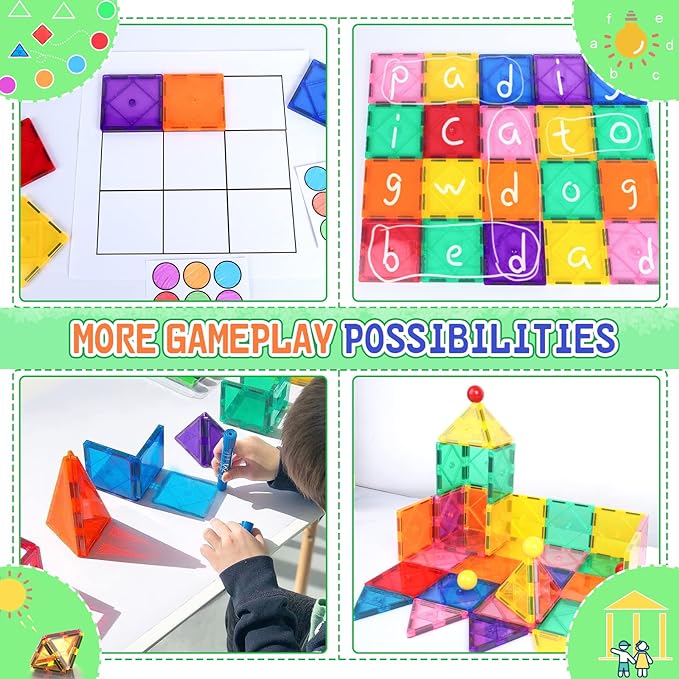 • 【MEANINGFUL TOYS FOR TODDLER KIDS】 The magnetic tiles set helps toddlers to recognize colors, number graphing, build patterns, and shape puzzles. A building toy for kids ages 4-5 to build houses, animals, and simple addition sentences. Science toys for kids ages 6-8, magnetic principles, gravity, and structure