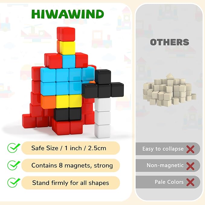 - Open-Ended Creative Building Toys : Unleash your child's creativity and engineering skills with Hiwawind magnet blocks. As kids explore structures of different levels of difficulty, they'll experience pure joy at every step of their building journey and turning toddlers' imagination into reality. Great building blocks for toddlers to foster their problem-solving abilities, spatial awareness and color coordination skills.
