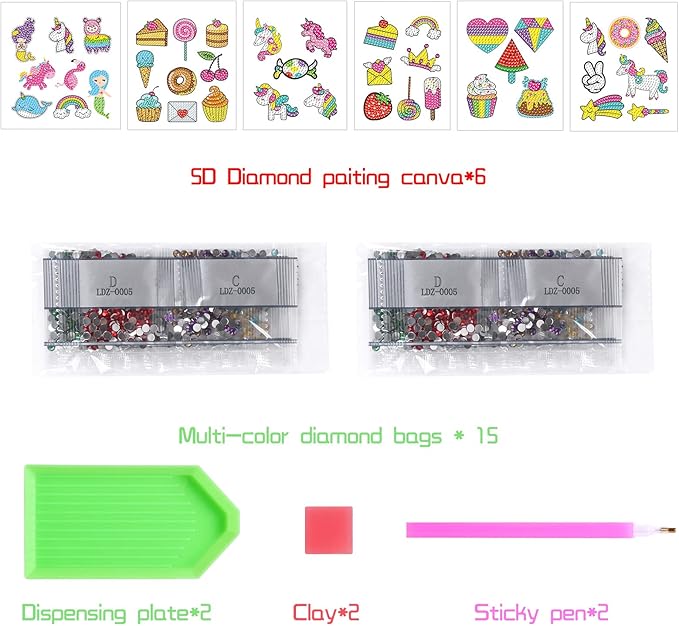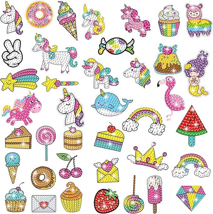 - Super Valuable Pack: 41 Pieces cute diamond stickers kits inside(Unicorn,Ice-cream,mermaid,cake,magic and rainbow,etc), sizes range from 2.5 inches to 3.6 inches. Complete kit containing everything you need: stickers, resin diamonds, pen, plate, jelly gum.