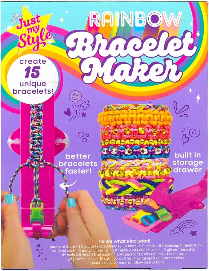 - SET INCLUDES: 1 Bracelet-Making Tool, 8 Paracord Bracelet Clips, 8.75 yds. Each, 8 Skeins Satin Cord (2 Blue, 1 Orange, 2 Pink, 1 Rainbow, 1 Yellow, 1 Purple) 2 yds. Each, 4 Skeins Metallic & Glitter Friendship Thread (1 Gold, 1 Silver, 1 Pink Glitter, 1 Purple Glitter), 4 Skeins Neon Rope (1 Pink, 1 Green, 1 Yellow, 1 Purple) 2 yds. Each, 1 Skein Multi-Colored Paracord (2 yds.), 2 Skeins Metallic Satin Cord (1 Blue, 1 Purple) 2 yds. Each, 50 Metallic Silver & Gold Round Faceted Beads, 50 Silver & Gold E-Beads, Easy-to-Follow Instructions