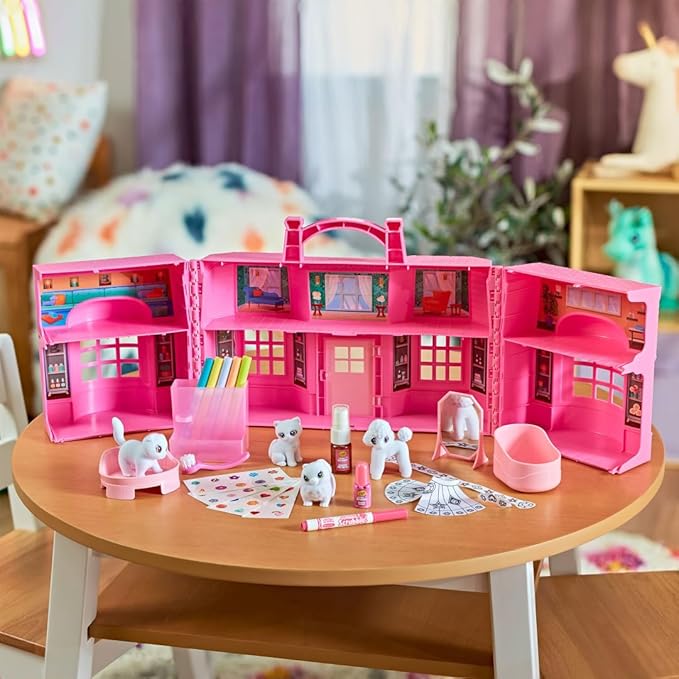 - TOY FIGURES & PLAYSET: Includes 1 Large Salon that doubles as storage solution, 4 Pets, 6 Markers, 1 Scented Spray Bottle, 3 Washable Sticker Sheets, and 1 Pearlescent Paint Bottle.