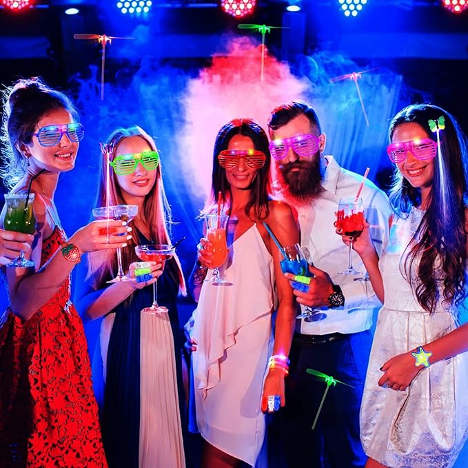 - 【Premium Quality】Our party favors are made with environmentally friendly high quality materials that are non-toxic, safe, Light weight and reusable. The smooth edges of the glasses protect you and your child's delicate skin. 5 LED blackout glasses lights will not block the view. Our ergonomic design fits all sizes, making it suitable for both adults and children.