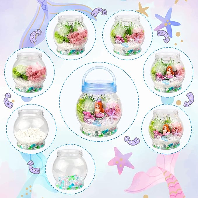 - 【Complete Kit】: Comes with everything needed to create and glow your mermaid garden kit from start to finish! 1 plastic jar with handle,1 Submersible light(batteries included),1 Remote control(batteries included), 2 moss, clear crystals, green crystals and blue crystals, large clera crystals, white pebbles, 2 plastic plants ,1 mermaid figurine, 1 starfish *1 coral, 2 LED string lights(batteries included), 1 Greeting Card and 1 User Manual.