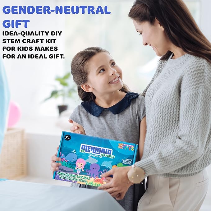 - 🧜♀️ PERFECT FOR YOUNG CREATIVES: Our mermaid and sealife world kids sewing kit for kids ages 8-12 includes all the tools and materials needed for fun. Includes 9 felt characters, 9 colors of embroidery thread, 2 needle threaders, 1 pencil color set, stuffing (1.06 oz/30g), 1 coloring book, and easy instructions to guide them through the process. Additionally, it includes 1 safety scissors for safe crafting. It's an ideal way to introduce children to crafting and sewing and skill development.
