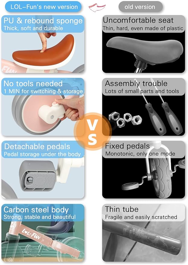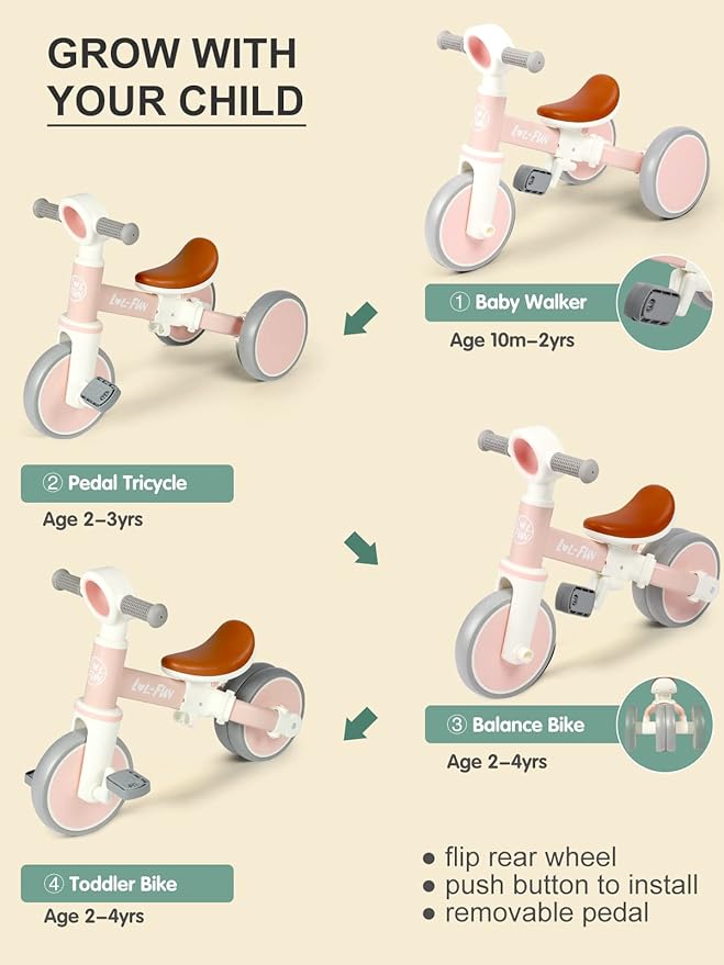 - 4 MODES: Newly mobile toddler wants to move in as many ways as possible. LOL-FUN 4 in 1 balance bike for 1-4 years old boys girls toy, which let kids scoot or roll around, are an ideal first birthday gift on the path to pedal bikes, helping them develop strength, balance, and nerve while they learn how to steer and adjust their speed