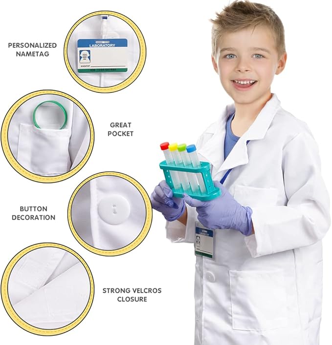 - The washable scientist coat is made in High-quality Material and suitable for most age 4 - 8 years old boys and girls . STEM educational learning toy set to create an authentic home laboratory experience. They can Encourage your child with the love of Science, Technology