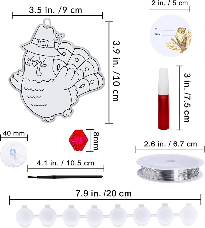 - Size: Thanksgiving sun catchers are about 3.5"-4.4" long and 4.2"-4.6" wide. Each bottle of suncatcher paint is 0.2 fl oz/6ml in capacity. Each mini empty paint pot holds 0.06 fl oz /2ml of paint. Acrylic beads are about 0.3" in diameter. Fishing thread is about 590.5" long. Suction hooks are about 1.5" in diameter. Each fall gift label sticker is about 2". These cute autumn window paint art suncatchers can be used as ornaments on the kitchen windows, trees, glass door, car windows, and so on.