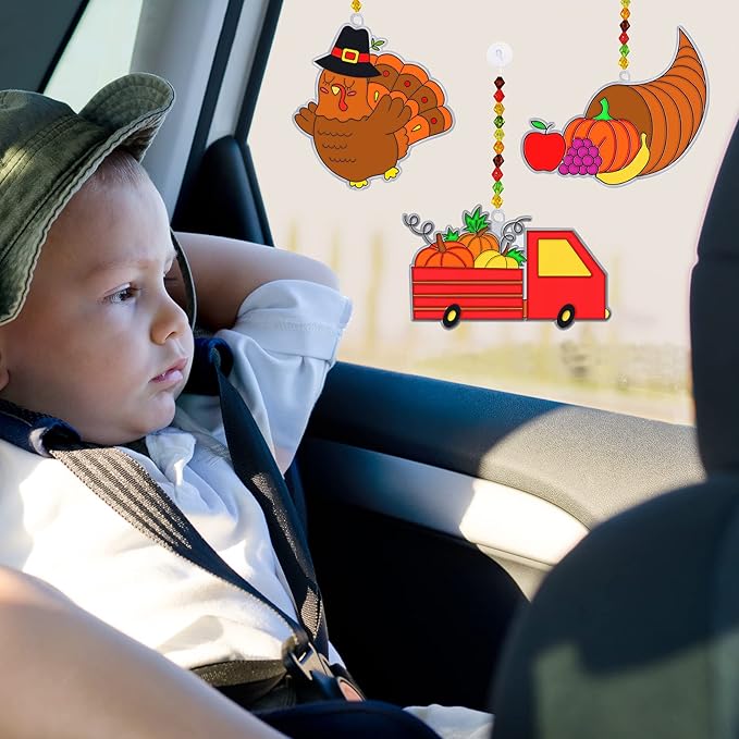- Quantity: 24 sets fall Thanksgiving suncatcher ornaments decorations DIY suncatcher window paint art craft kits include 24 pcs Thanksgiving sun catchers in 8 designs, each design has 3 pcs. 16 bottles of 8 fall colors suncatcher paints (6ml per bottle), 1 strip of 8 empty paint pots, 24 pcs paintbrushes, 288 pcs acrylic beads, 1 roll of fishing thread, 24 pcs suction hooks, 24 pcs fall gift stickers. Each suncatcher has a hole at the top for hanging. Kids and adults can enjoy this art project.
