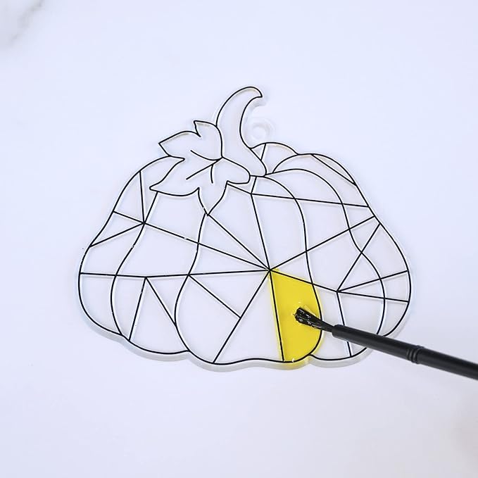 - Quantity: 27 sets pumpkin suncatchers DIY window paint art suncatchers fall craft kits include 27 pcs pumpkin sun catchers in 9 designs, each design has 3 pcs. 16 bottles of 8 fall colors suncatcher paints (6ml per bottle), 1 strip of 8 empty paint pots, 27 pcs paintbrushes, 324 pcs fall acrylic beads, 1 roll of 393" long fishing thread, 27 pcs suction hooks, 30 pcs fall gift label stickers. Each suncatcher has a hole at the top for hanging. This fun art project is perfect for kids and adults.