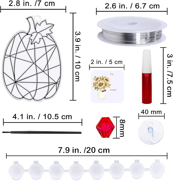 - Size: Pumpkin sun catchers are about 2.7"-4.1" long and 2.5"-3.9" wide. Each bottle of suncatcher paint is 0.2 fl oz/6ml in capacity. Each mini empty paint pot holds 0.06 fl oz /2ml of paint. The acrylic beads are about 0.3" in diameter. Fishing thread is about 393.7" long. Suction hooks are about 2.3" in diameter. Each fall gift label sticker is about 2.2". These cute window art decorations are ideal for hanging in the windows, trees, glass door, or mirror bring the sunlight in.
