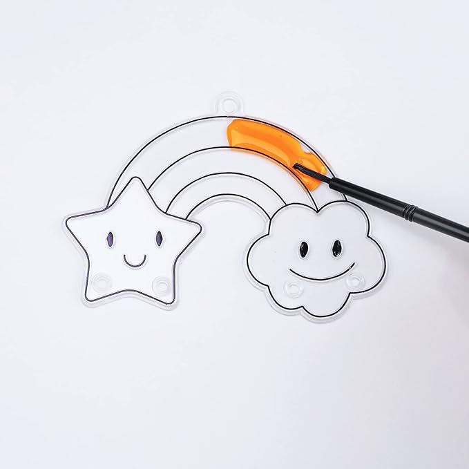 • Color: These transparent rainbow window suncatchers are shaped like a rainbow arching between two cute clouds and accented with a smiling sun or stars. The surface has pre-cut lines, so you can easily add different colors to the suncatchers. Suncatcher paints have 8 colors including red, orange, yellow, green, turquoise, blue, purple, and white. These translucent paints will recreate the classic colors of the rainbow arch as the sunlight shining through. Acrylic beads are in rainbow colors.