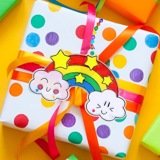 - Color: These transparent rainbow window suncatchers are shaped like a rainbow arching between two cute clouds and accented with a smiling sun or stars. The surface has pre-cut lines, so you can easily add different colors to the suncatchers. Suncatcher paints have 8 colors including red, orange, yellow, green, turquoise, blue, purple, and white. These translucent paints will recreate the classic colors of the rainbow arch as the sunlight shining through. Acrylic beads are in rainbow colors.