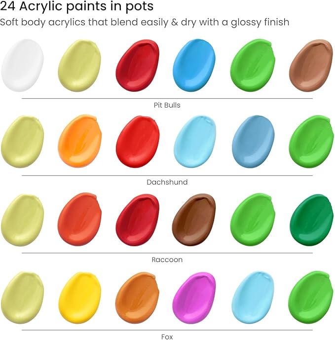 - Illustrate Your Imagination: Bring the fun of the Animal World into your home. This acrylic paint set comes with four different canvases depicting: a dog, a raccoon, a fox , and a pair of dogs. Your little artist can learn about colors and Fairy Tale while enjoying some artistic fun.