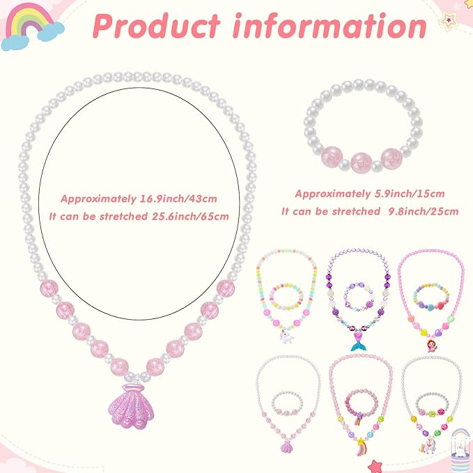 - Chic design: these jewelry toys have multiple styles, each necklaces and bracelets has different cute designs, such as shell, unicorn, star, mermaid, heart beads, glass beads and so on; Add some colorful to your look with some pretty stretch bracelets and rings, the necklace and bracelet set has the elastic, the ring has an open design, which is easy to put on and remove
