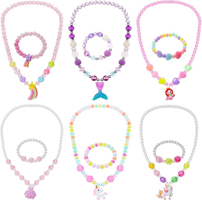 - What You Get: 6 pieces dress up jewelry necklaces and 6 pieces bracelets, provide you with a beautiful and complete girls dress up jewelry set, stand out anytime, anywhere; Please note that some products are purely handmade, and occasionally there is a little glue thread and glue overflow, but it does not affect the normal use and is not a quality issue