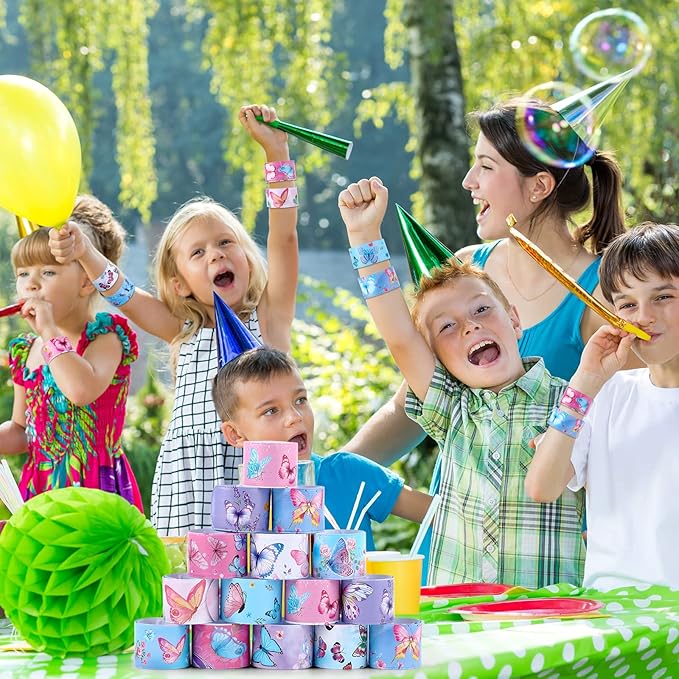 - Butterfly Theme Slap Bracelets: these snap bracelets are designed with various butterfly patterns, which are very suitable for butterfly themed party gift bags, fairy party and more