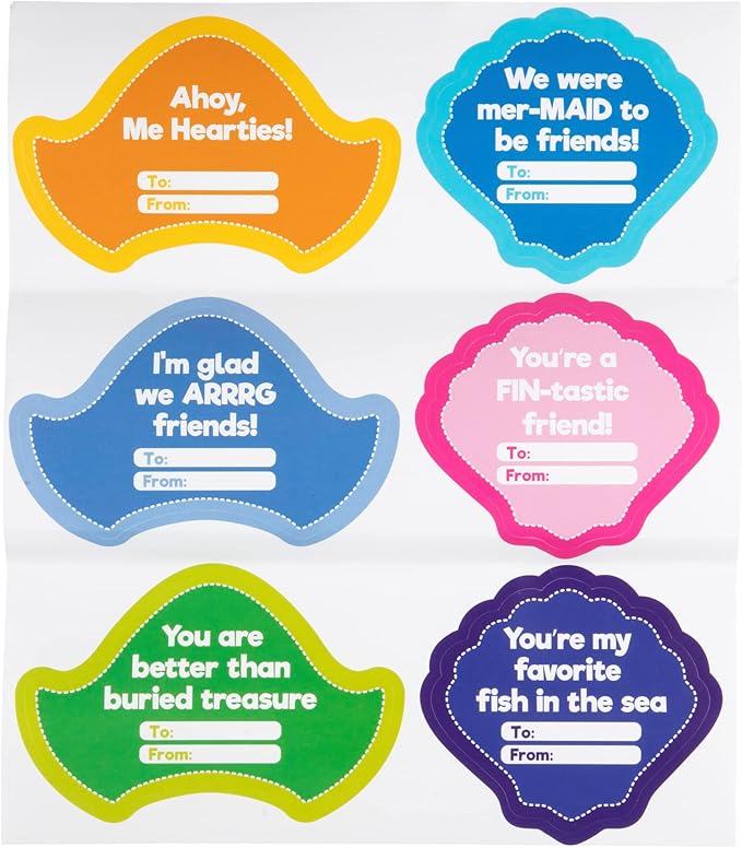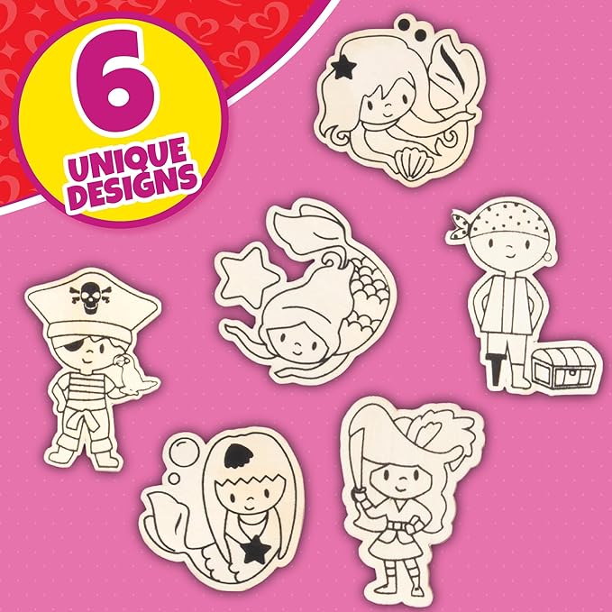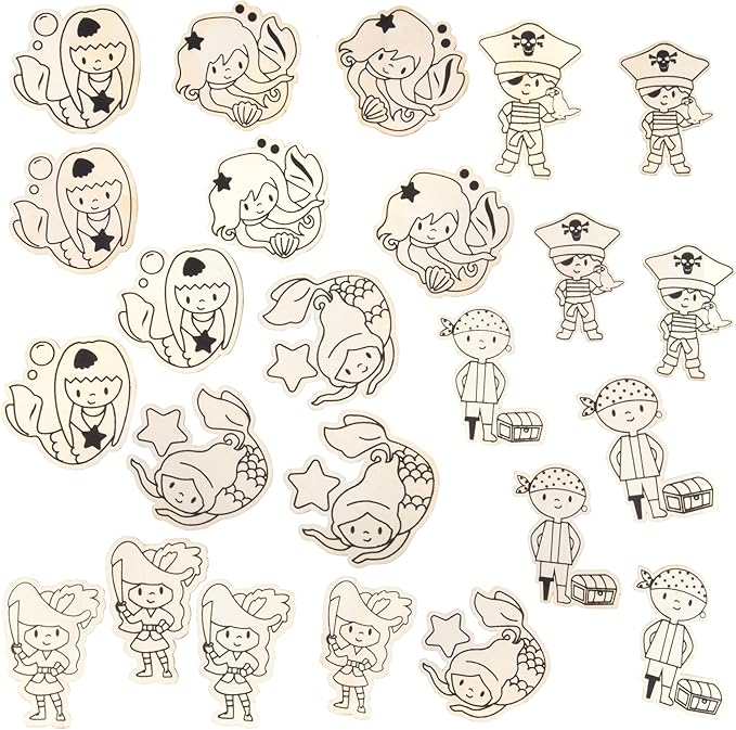 - Comes with 12 mermaid and 12 pirate wooden paint kits, matching stickers, and adorable cards shaped as seashells and pirate hats!
