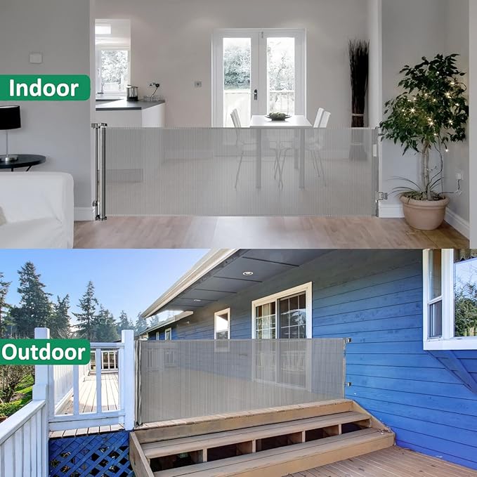 - Indoor and Outdoor Safety Gate: Each set includes 1 extra long mesh gate and required mounting accessories. Child gate is perfect for Indoor and Outdoor doorways, stairs, hallways, decks, etc.