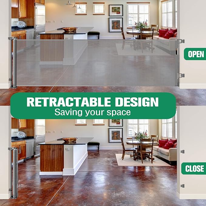 - Retractable Design - Saving Space: Retractable gate is easy to use in high-traffic areas and can be used as space barrier, baby fence and more, such as easily separating a dining room from other open living areas. The retractable dog gate can be completely retracted when not in use, taking up no space.