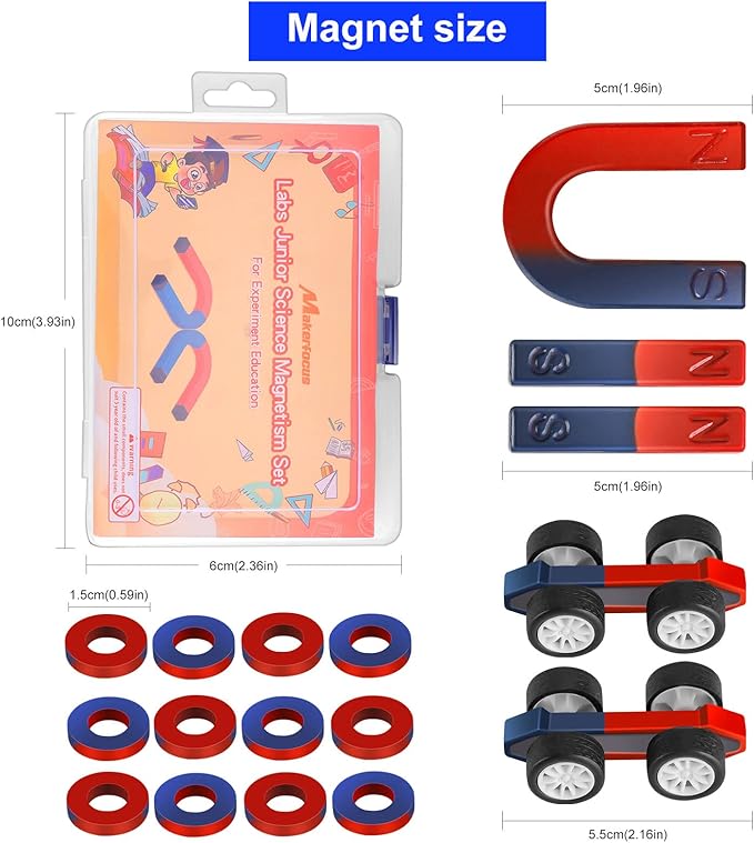 - Magnet Beginner Set: 14pieces magnets and accessories for scientific experiments, 2 x bar magnet, 1 x u-shape magnet, 6 x ring ceramic magnet, 1 x compass(plastic material) 3 x magnetic car, 1 x iron filings box