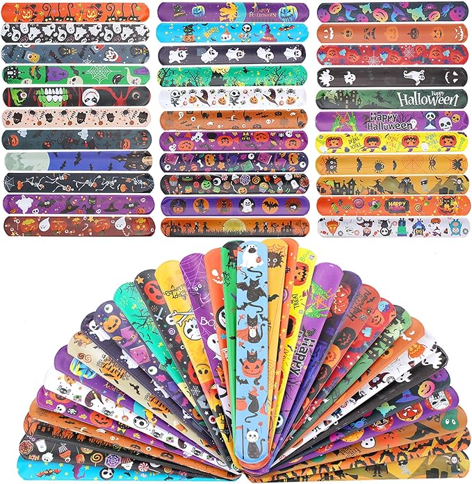 - COMPREHENSIVE SET: Our Halloween Trick or Treat Toys include 120 pieces of stylish slap bracelets in 60 different designs. The set includes stunning Halloween theme designs,which contain bats,pumpkins, skulls etc. fitting the slap bands on the wrist perfectly