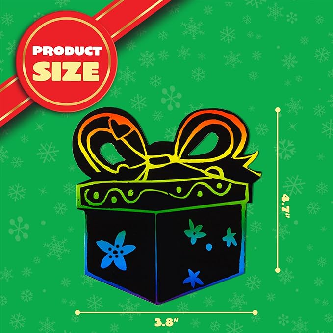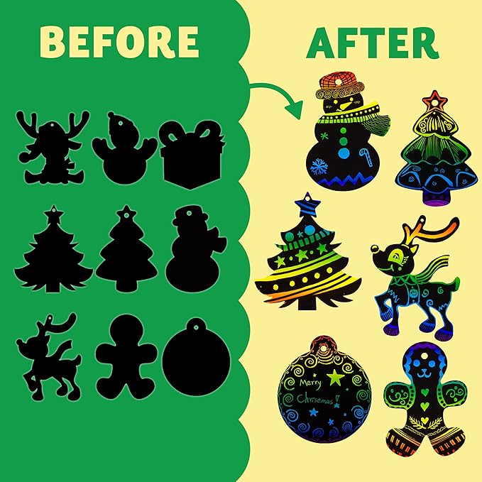 - INSPIRE CREATIVITY. Bring your kids’ imagination to life! When you scratch, a rainbow of colors will reveal. These ornaments will add some homemade holiday cheer to Santa, Reindeer, Snowflakes, Gifts, Christmas Trees, and other holiday décor.