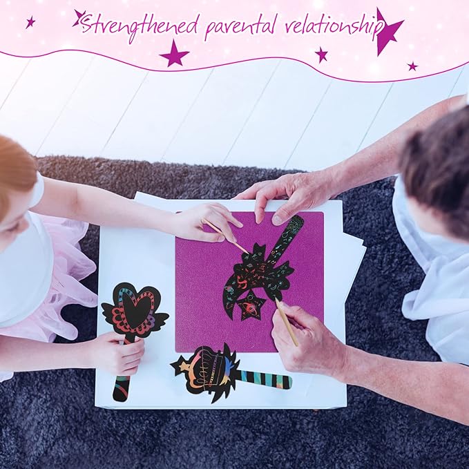 - 【Waving wand and firing magic】Thanks to the fixed design, kid can wave a wand that can be held up and straightened. Using the rainbow scratch paper wand, kids can play games together, and carve their blessings on the wand scratch paper for friends