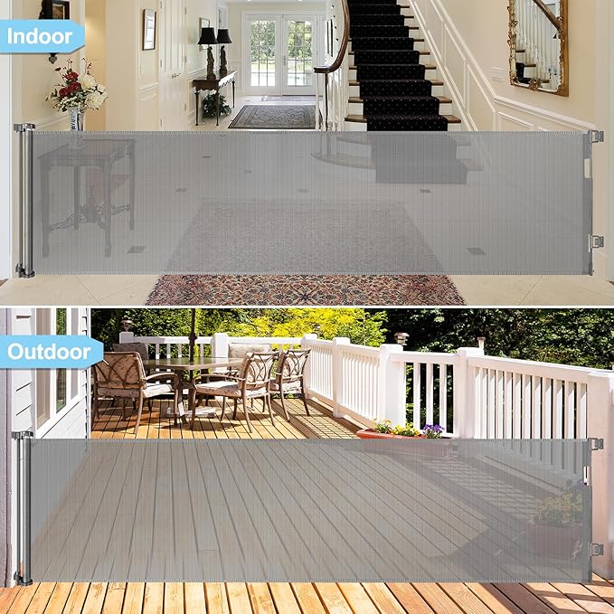- [Perfect Fit Indoor and Outdoor] retractable dog gate can be installed at bottom of stairways, doorways, hallways, deck, porch indoor and outdoor.