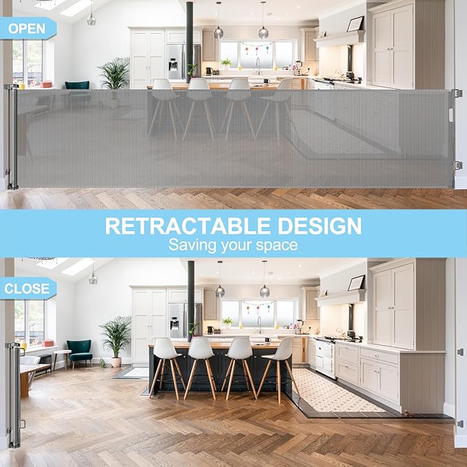 - [120" Extra Wide & Retractable Design]Extra wide retractable baby gates can be extended up to 120 inches wide and 35 inches tall. (inner size:120" wide,full size:122" wide). Mesh can be completely retracted away when not in use.