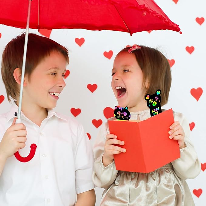 - What You Will Get: The package comes with 28 sets. And each set contains 4pcs black scratch cards, 1pcs scratch pen, and 1pcs name card. It is a special gift for kids to DIY their unique Valentine’s Day scratch card.