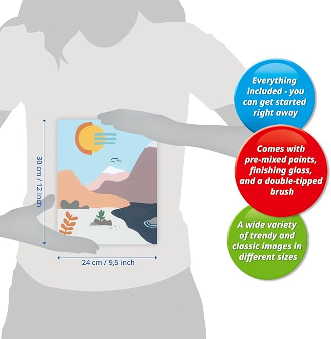 - Everything Included: Water-based acrylic paints in resealable pots, 1 packet of finishing gloss, 1 double-tipped brush, 2 paint holder palettes,1 cardboard canvas, 1 painting reference guide, 1 set of simple instructions, and 1 picture hanger.