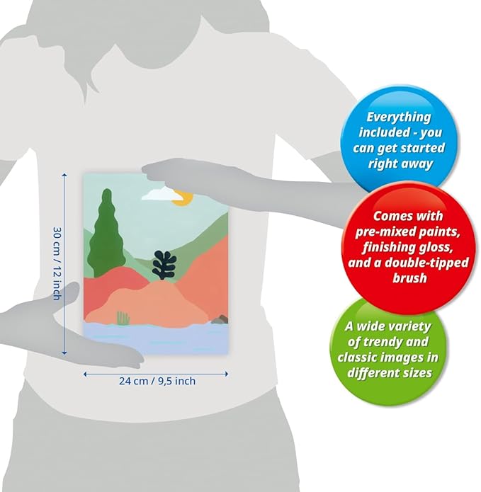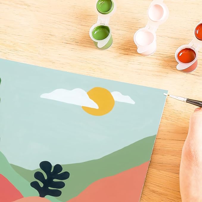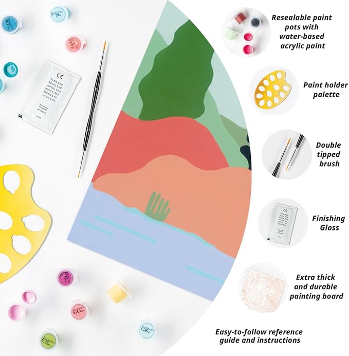 - Everything Included: Water-based acrylic paints in resealable pots, 1 packet of finishing gloss, 1 double-tipped brush, 2 paint holder palettes,1 cardboard canvas, 1 painting reference guide, 1 set of simple instructions, and 1 picture hanger.