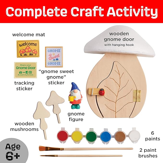 - KIDS PAINTING CRAFTS: Everything you need to paint and decorate a gnome door is included, just add imagination! Complete kids painting craft comes with a wooden gnome door (6”w x 7.75”h x 1.25”d), weather-resistant paints, a welcome mat, a gnome figure, and more!