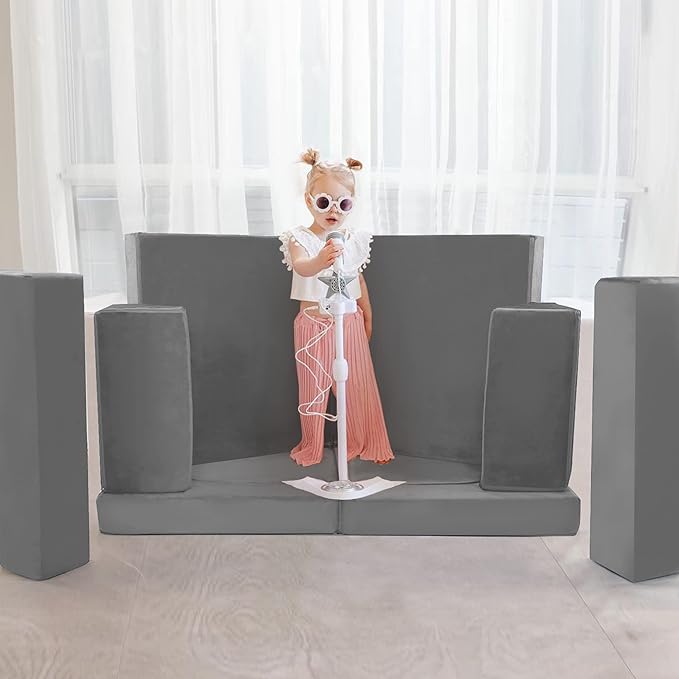 - [Multifunctional 10-Piece Kids Play Couch] This 10-piece toddler couch includes 2 foldable seats, 2 back cushions, 2 armrests, and 2 cushions that split into 4 parts for fort-building. Converts into a fort, tunnel, chairs, playhouse, rocket ship, bed, and more.