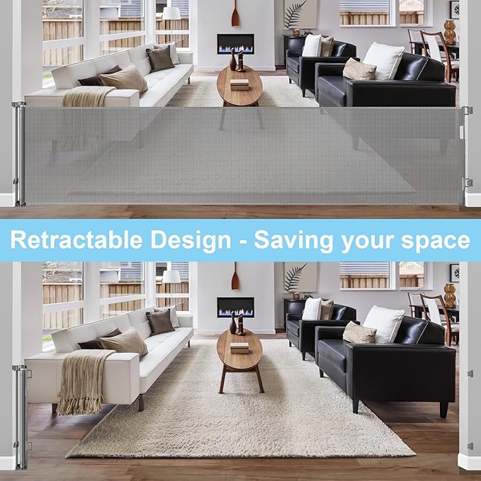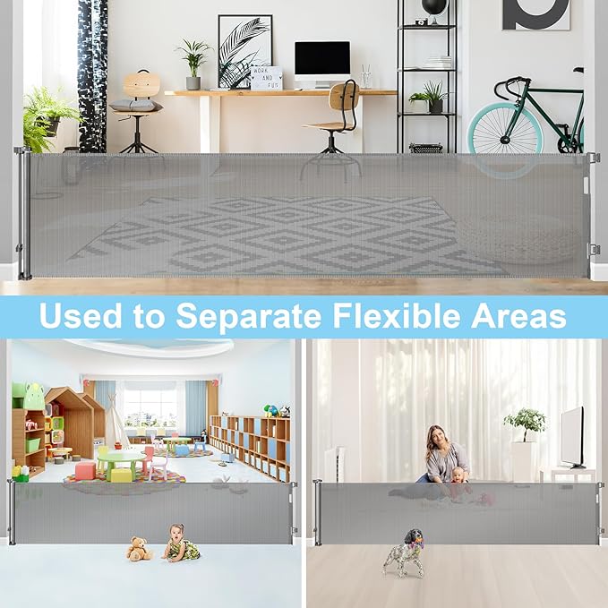 - Versatile Retractable Gate : extra wide retractable baby gates can be used as room dividers to create a flexible area for you or your children and pets, and can also be used as an alternative to a dog crate.