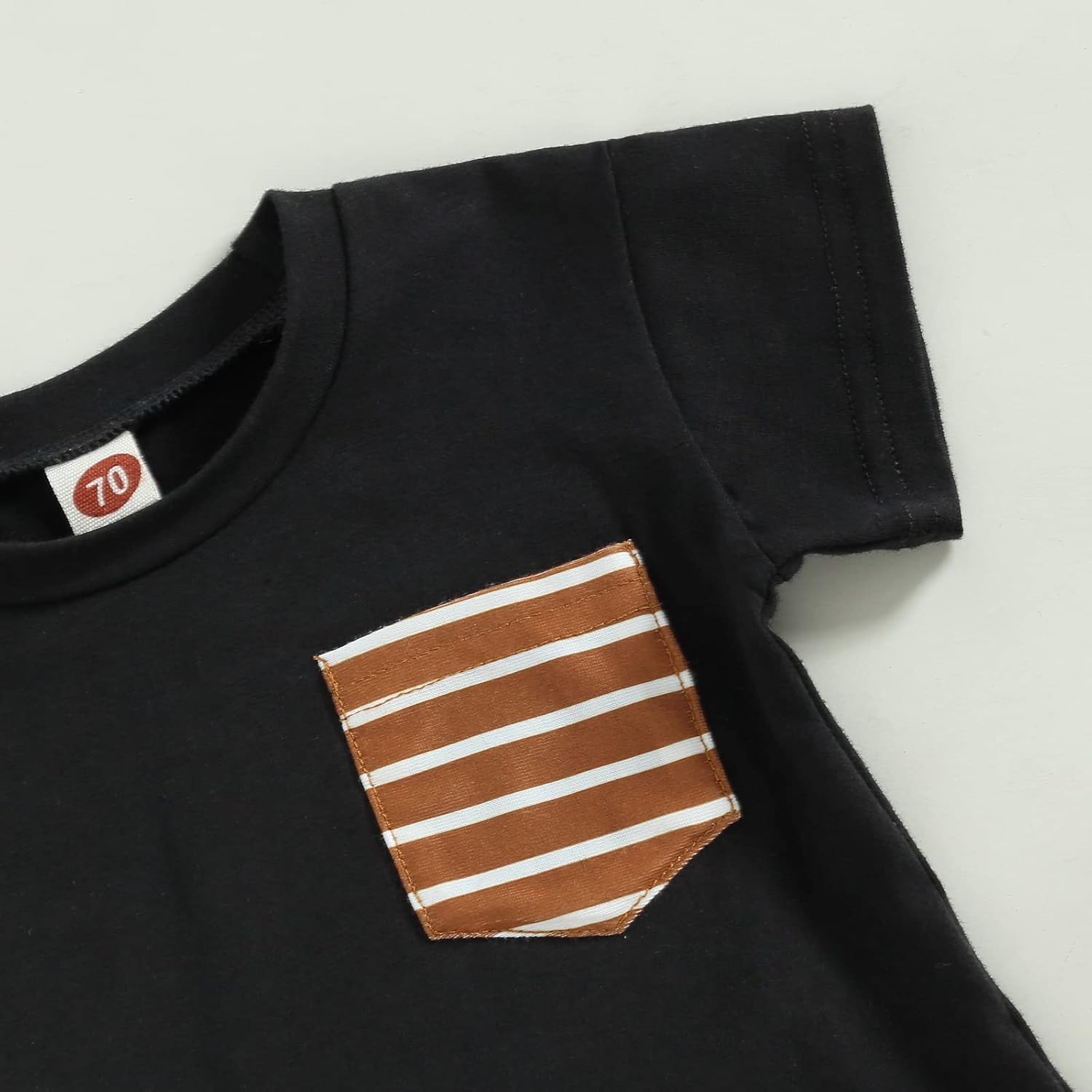 • Relax Crew Neck, One Pocket Front, Striped Pattern, Comfy Short Sleeve T Shirts Tee Tops, Elastic Waist with Drawstring Shorts, Side Pockets, Comfy and Cute Newborn Baby Boys Summer Outfits Clothes, Infant and Toddler Boy Comfy Cotton Shorts Sets