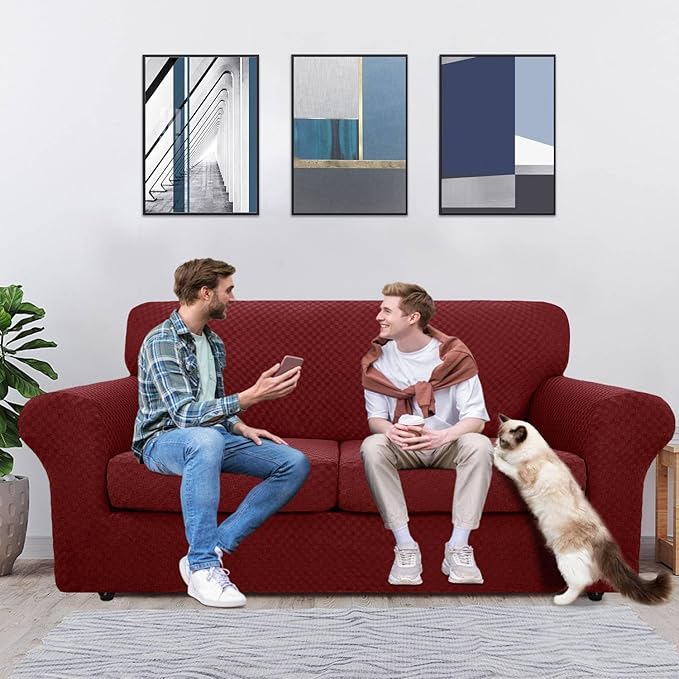 MAXIJIN 3 Piece Stretch Couch Covers for 2 Cushion Couch Sofa Slipcovers with 2 Extra Large Seat Cushion Couch Jacquard Loveseat Sofa Couch Cover for Dogs (2 Cushion Sofa, Wine Red)