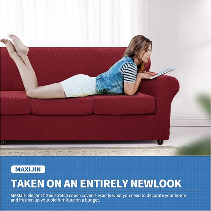 - HIGH STRETCHY - MAXIJIN fitted sofa slipcovers are made of high quality 85% polyester and 15% spandex fabric, which is soft in texture, comfortable in feeling and with good breathability. Due to its high stretchable feature, our magic couch cover is more flexible to be applied to various couches,such as t-cushion couches, box cushion couches, high back couches, small and extra large leather couches. Improved thick cloth is more durable and wear resistant