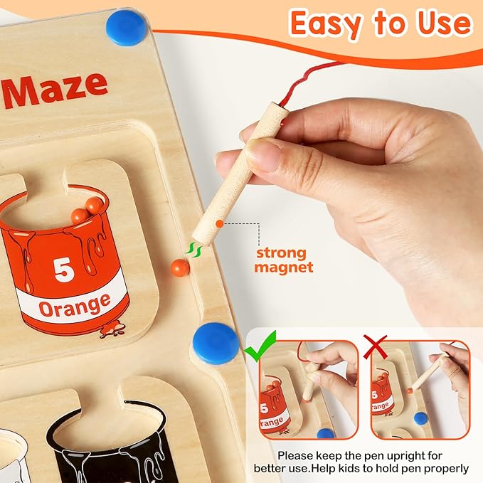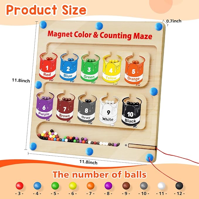 - Number & Color Maze: Our wooden magnet maze makes fun for toddlers to explore colors and numbers. The sturdy magnetic maze is designed as 10 different colored paint cans, each of which are printed the number from 1 to 10.There are 75 magnetic beads in the track, corresponding to the color paint cans. Kids old can develop counting and matching skills from the interesting montessori toy for 3 4 5 years old.