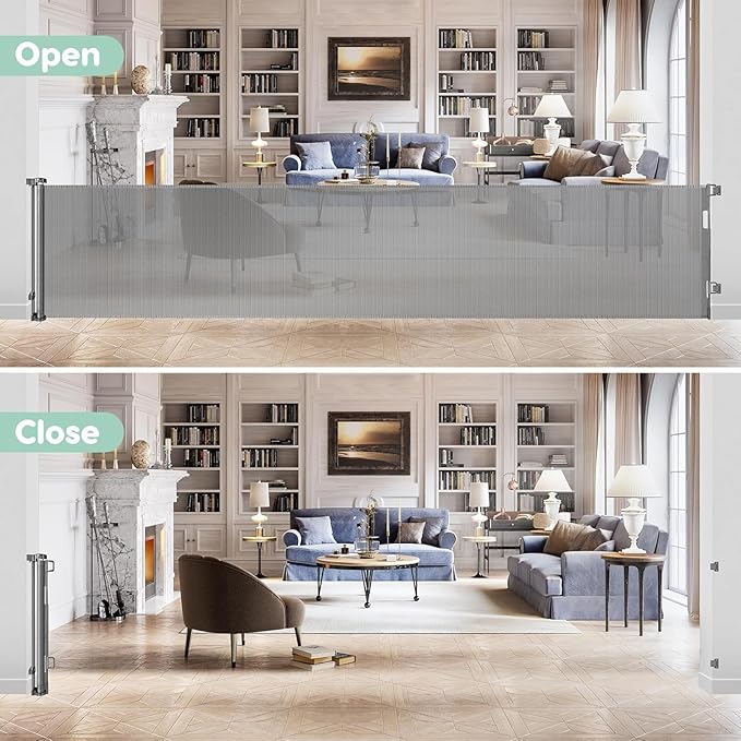 - Indoor / Outdoor Gate : extra long retractable baby gate can be used indoors and outdoors, such as in bottom of stairs, doorways, hallways, fireplaces, front doors, porches, garage doors, decks, patios.
