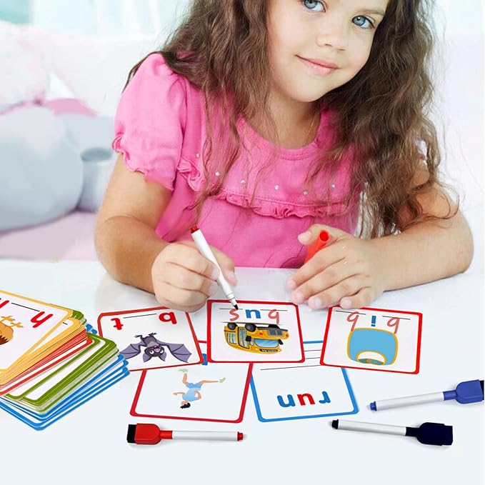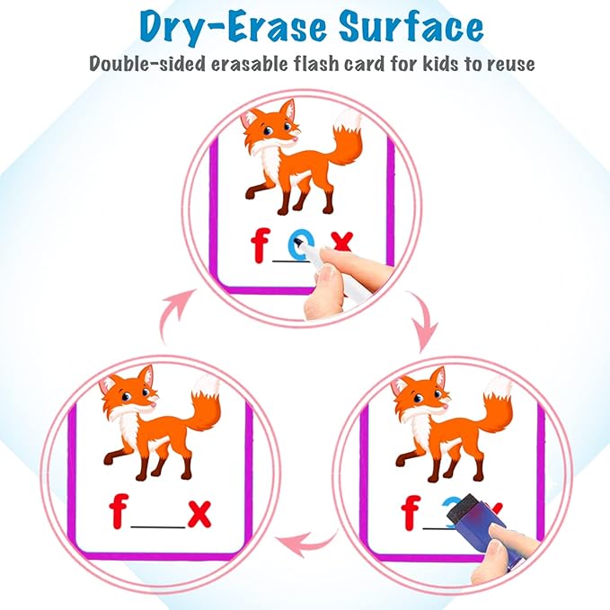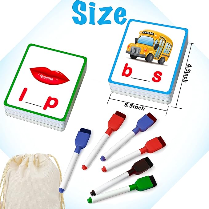 - Short Vowel Spelling CVC Flashcard Set: Contains 100 Pcs double-sided CVC sight word cards and 6 dry-erase markers, easy to write and erase, wipable for repeated use. Also comes with a portable bag for easy storage and carry, The flashcards have perfect size for children to read and write easily