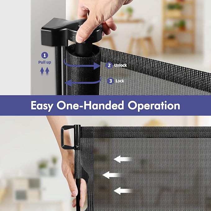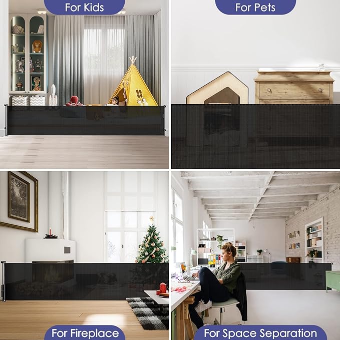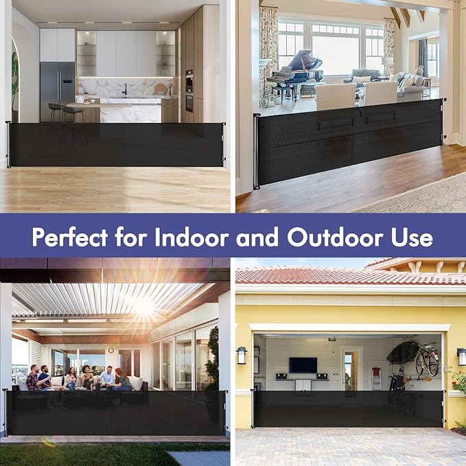 - [Wide Retractable Gate to Save Space] - This retractable dog gate is easy to use in high traffic areas. When not in use or when guests are visiting, the long baby gate can retract to save space. Give your home more space and flexibility, and you don't have to worry about tripping over a bulky gate that's always in the way.
