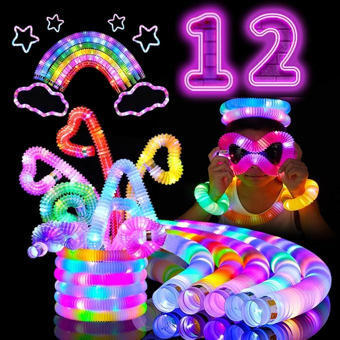 - 【Newest Glow In The Dark Party Favors】Here the newest LED Pop Tubes fidget toys is coming! Combining with the traditional pop fidget tubes and multi-color LED lights, these fidget toys pack can be bent, connected, stretched, twisted into any shape rely on your creativity. Imagine a series of funny light shows that can now light up your celebration of glow party supplies in dark, I'm sure your children will be inspired by this surprise light show