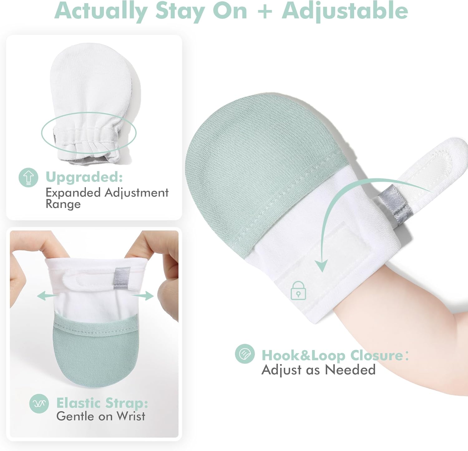 HAPIU Baby No Scratch Mittens Stay On, 100% Cotton Breathable, Adjustable Infant Gloves for Boys Girls, Newborn - 12 M