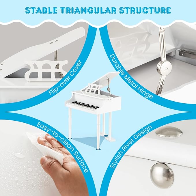 - 【Perfect Educational Toy】The mini grand piano comes with a comfortable stool for kids to sit, thus they can play with more coziness. Also, designed with a functional music stand, kids can learn to play the piano with higher efficiency.