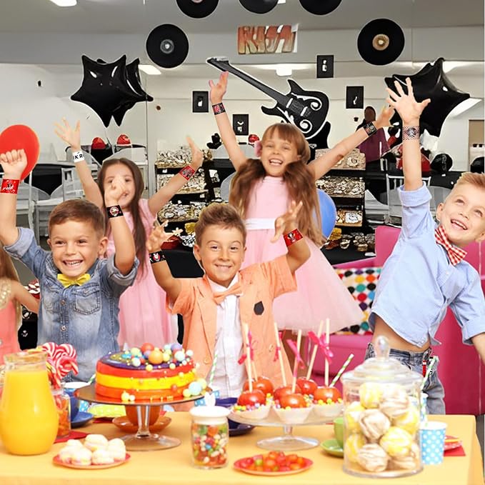 - Rock Star Party Supplies: Each of rock theme slap bracelets length about 8.67 inches/ 22 cm , and its width is about 1.18 inches/ 3 cm, coordinate with its flexible and stretchable feature, which can be stretched to fit different hand sizes, great for adults as well as kids